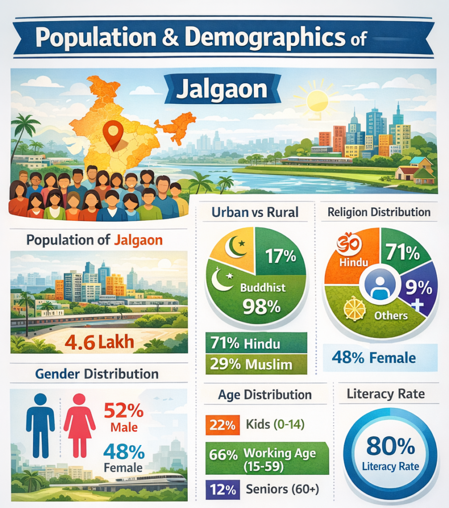 The infographic also highlights Jalgaon’s literacy rate of 80%, suggesting a good level of educational awareness and access to schooling across the district. Overall, the image effectively summarizes Jalgaon’s demographic strengths, diversity, and development through a well-structured and visually appealing presentation.